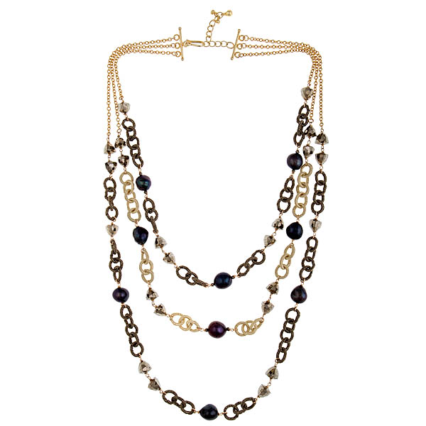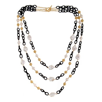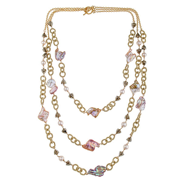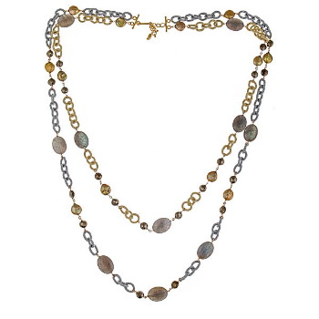 I purchased silk chain in four different colors, pewter, black, gold and brown. I purchased quite a lot. This stuff is not cheap. It’s well made and silk, wow! I was caught in the moment and excited about a new look. I used different types of freshwater pearls, pyrite, labradorite, and vermeil beads, chaining and clasps.