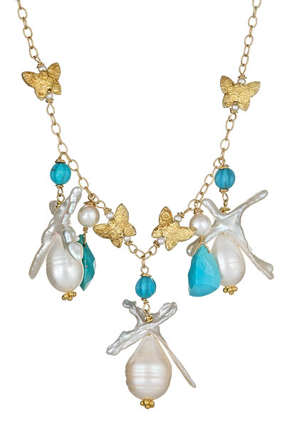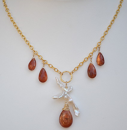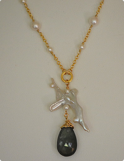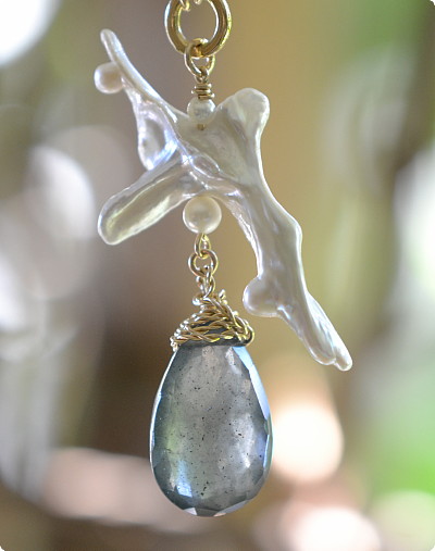I plan on making more of these.  Each one with a different semi-precious bead to dangle.  Perhaps all pearl like the one in the photo.  That one is truly one of a kind.  It’s so bubbled.  I don’t have another like it, besides it looks like a prehistoric fish.  Notice it’s tail flapping!