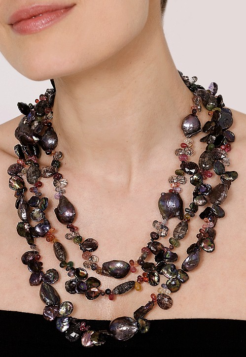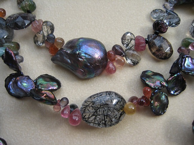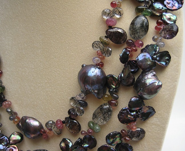 Multi color semi precious beads: Tourmalines, Rutilated Quartz.   I used faceted and smooth for different textures.   Black Keishi pearls in sets of three to tie it all in.