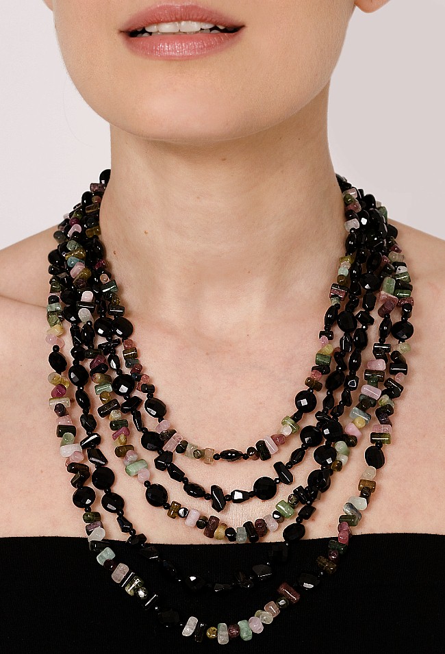Tourmaline Barrel shapes in light colors. Black Spinels in round disks and twisted narrow nuggets.
