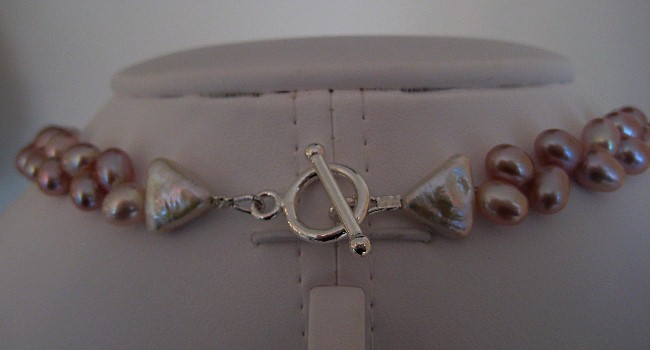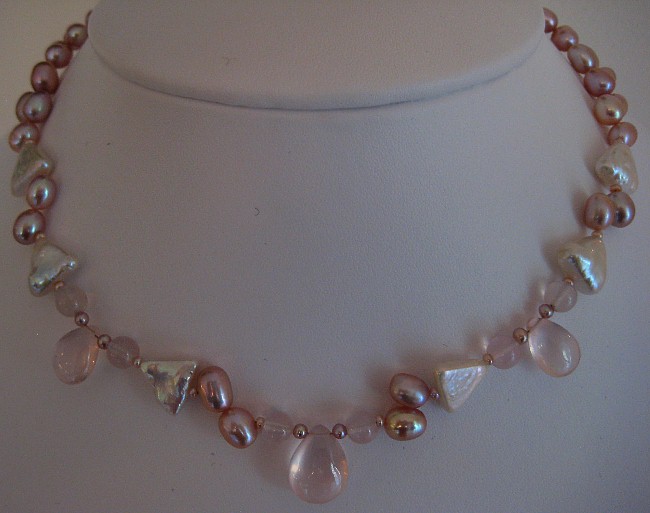 I used Rose Quartz Pear Shaped drops and Rounds.   Pink Triangular Pearls.  Lavendar Egg Shape Pearls and tiny lavendar Rounds.