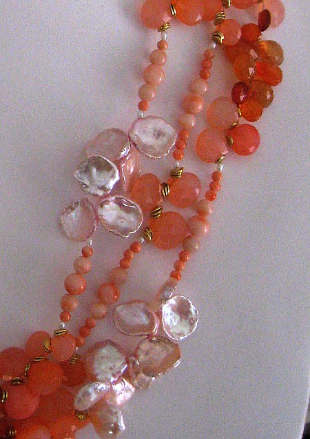 It’s a fun summery necklace. The lighter peach color beads are the chalcedony. The darker orange, carnelian. Different size recycled coral beads from an old necklace I had purchased in a thrift shop. There are tiny disk shape vermeil beads that I stacked together.