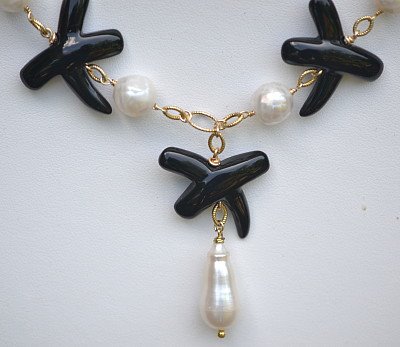 I call this necklace Puttin on the Ritz. Originally the Onyx X shapes were made for post earrings. I had them redrilled in order to make a necklace. These were vintage old stock and I wanted a new twist to these beads.
