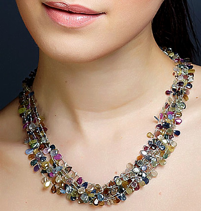 This necklace is made of multi color rose cut sapphires. Clear, pink, red, blue, purple, brown, green, and light gray.