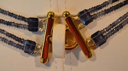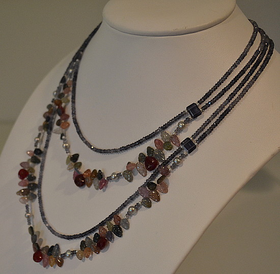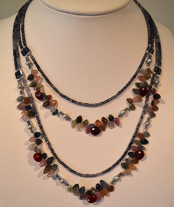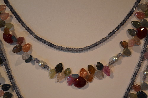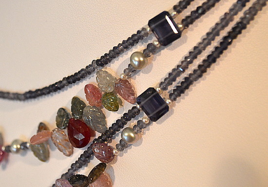I chose Iolite rondelles which are very light to dark. I did this to enhance the foliage and berries.